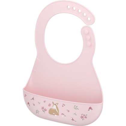 Babero de silicona de la colección MIO con cierre ajustable en el cuello y bolsillo profundo para atrapar la comida. Fácil de limpiar y transportar.