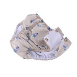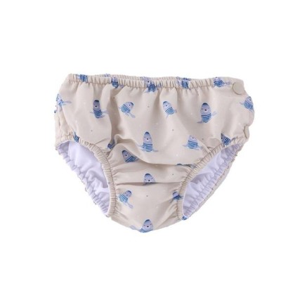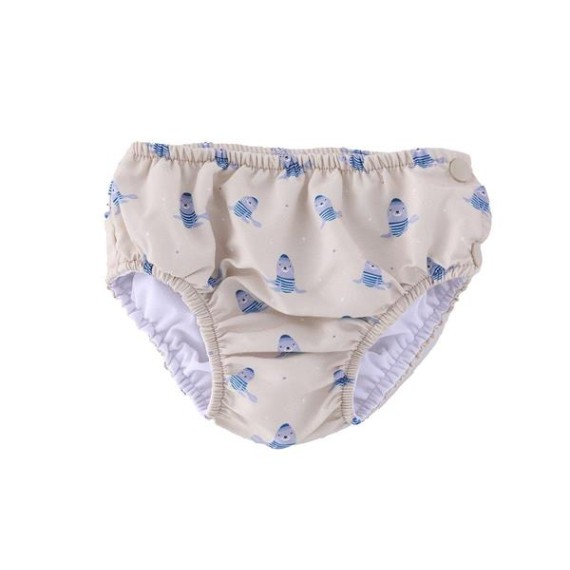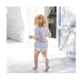 Bañador pañal de la colección Seal de Monnëka que ha sido creado con una tela especial que protege a la piel de los rayos solares además que evita fugas sólidas cuando el peque se está bañañdo en la playa o la piscina.