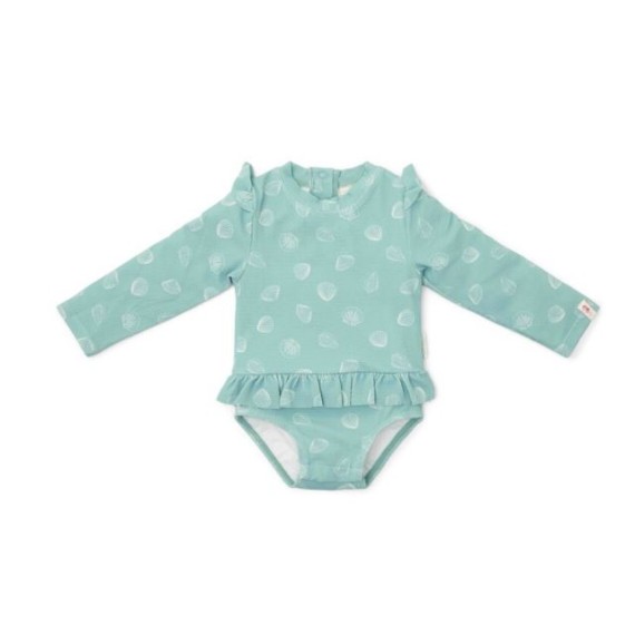 Con este precioso traje de baño harás un verdadero chapuzón en la playa. Luciendo como la chica surfista más linda del lugar. Coge tu tabla larga y dirígete a la orilla. Este lindo traje de baño de manga larga tiene una hermosa base verde menta adornada con un encantador estampado de conchas marinas blancas, creando un look imaginativo. Los hombros con volantes y la falda acentúan el ambiente alegre y femenino. La cómoda apertura con botones a presión en la parte posterior mejora la facilidad de ponerse y quitarse el protector contra erupciones, incluso si su pequeño está mojado y arenoso.