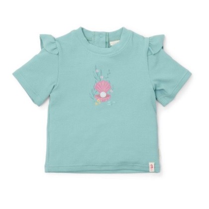 Este rashguard de manga corta te protegerá del sol mientras juegas todo el día. Tanto si te gusta construir castillos de arena como chapotear en el agua, la camiseta elástica te mantendrá cómodo todo el día. El rashguard azul surf de manga corta tiene una encantadora base verde menta con volantes en los hombros. La parte delantera muestra una perla en una ostra rodeada de plantas marinas y flores, añadiendo un toque caprichoso y encantador. Tu peque se mantendrá protegido y cómodo mientras disfruta de los días de verano en el agua. La cómoda apertura con botones a presión en la parte trasera garantiza una fácil puesta y retirada, incluso cuando está mojado y arenoso.