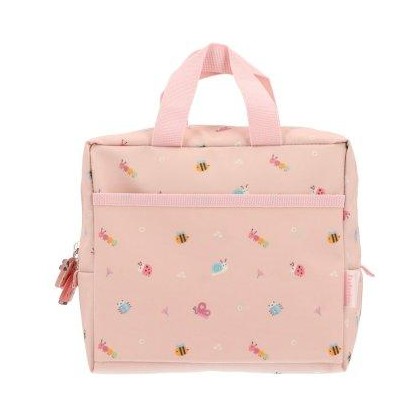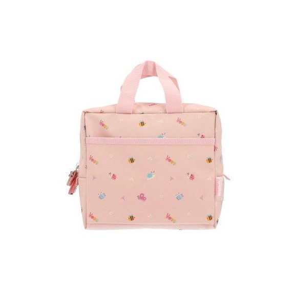 Tiene 2 asas cortas, para fácil transporte, y un bolsillito exterior donde puedes guardar cubiertos o pequeños objetos que necesites tener más a mano.
