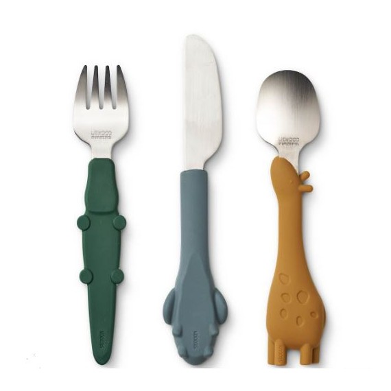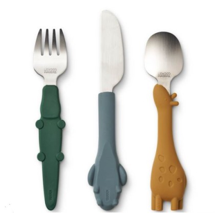 Cubiertos TOVE Liewood golden caramel mix. ¡Ofrece un toque de diversión animal a la hora de comer con los cubiertos Tove! De acero inoxidable con un exclusivo mango en silicona, estos duraderos cubiertos son perfectos para un optimo agarre por las pequeñas manos. ¡Una divertida e indispensable herramienta para animar y enseñar a tu peque a comer!