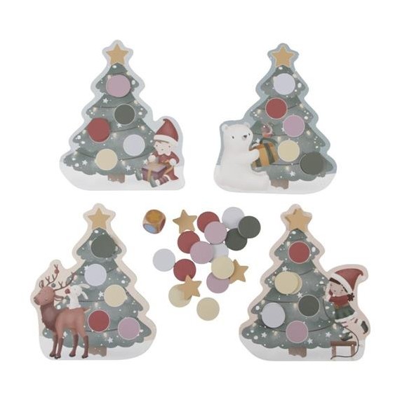 El objetivo del juego: Quién puede decorar más rápido su árbol de Navidad?.Cada niño recibe una tarjeta de árbol de Navidad con ilustraciones de 5 bolas de colores y un adorno. Los niños se turnan para tirar el dado de color. Cada color del dado corresponde a una bola con un color a juego, que luego se puede colocar en la tarjeta del árbol de Navidad. El que decore completamente su árbol primero es el ganador.