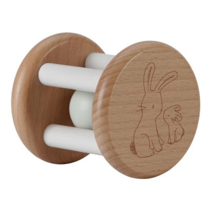¡Rueda y haz sonar el sonajero! Sigue haciendo rodar este sonajero de madera y el tintineo de la campana continúa. Intenta agarrarlo y agitar el sonajero hacia adelante y hacia atrás para obtener sonidos aún más alegres. Un fantástico juguete con el simpático diseño del conejito de la colección Baby Bunny para favorecer la coordinación mano-ojo.
