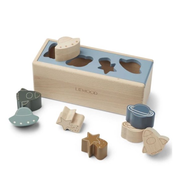 • La caja viene con ocho bloques de madera en cuatro formas diferentes
