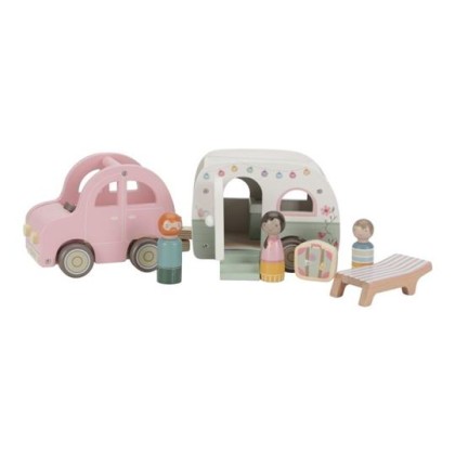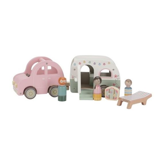 ¡Pon en una maleta tus sueños y vámonos a la carretera! Descubre el mundo aventurero con el bonito coche con caravana rosa. Acampa donde quieras y disfruta de la libertad de una casa de vacaciones en movimiento. Ya sea en la sala de estar, la sala de juegos o la cocina, saca la silla de playa, desembala y deja que los 3 muñecos disfruten del entorno. Las ruedas de suave rodamiento permiten que su pequeño se desplace sin esfuerzo por el suelo en busca de nuevos sitios para una fiesta de pijamas en la caravana. La puerta y el techo de la caravana se pueden abrir y las figuras son compatibles con la casa de muñecas y otros juegos como el avión y el autobús escolar. Deja que tu pequeño disfrute de la magia del viaje y el descubrimiento con este versátil juego de juguetes de madera.