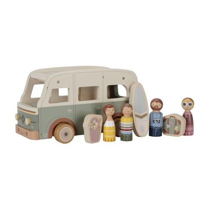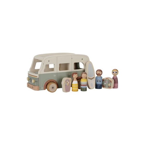 ¡Vamos a dar un paseo juntos! Levanta el techo de tu furgoneta retro y coloca los muñecos encajables en su interior.Furgoneta retro con accesorios como tabla de surf, maleta y bolsa de la compra en bonitos colores retro.