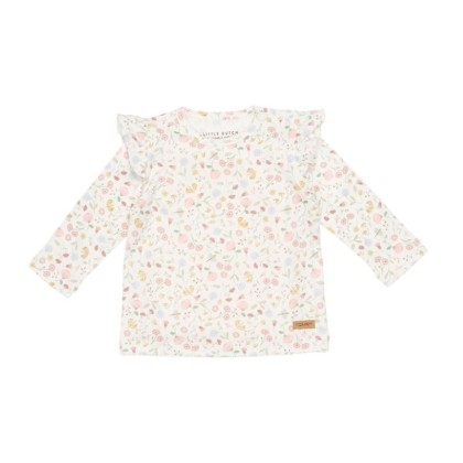 Flores y mariposas por todas partes. Realzada con un delicado estampado integral, esta camiseta de manga larga seguramente alegrará el día sin importar el clima. Los adorables detalles de volantes en los hombros añaden una sensación de luminosidad y luminosidad. Confeccionado 100% en algodón orgánico no tóxico certificado, tiene dos prácticos botones a presión en el hombro. Disponible en 50/56 , 62 , 68 ,74 y 86