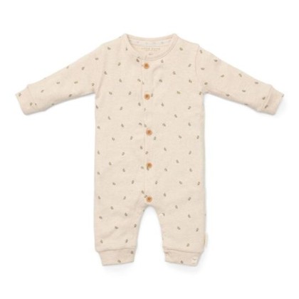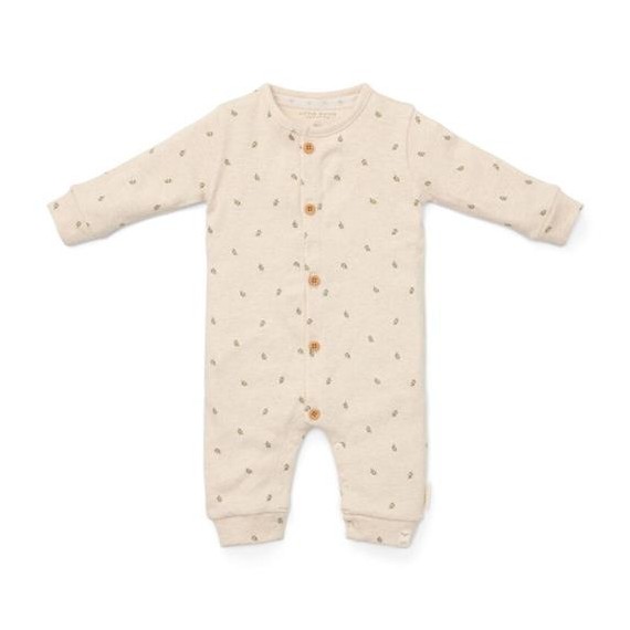 Con cierre total hasta aberturas en las piernas lo que hace que vestir y cambiar a tu pequeño sea muy fácil, material muy suave, color melange con estampado de pequeñas hojas, algodón orgánico, certificado Oekotex. 100% algodón orgánico.