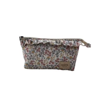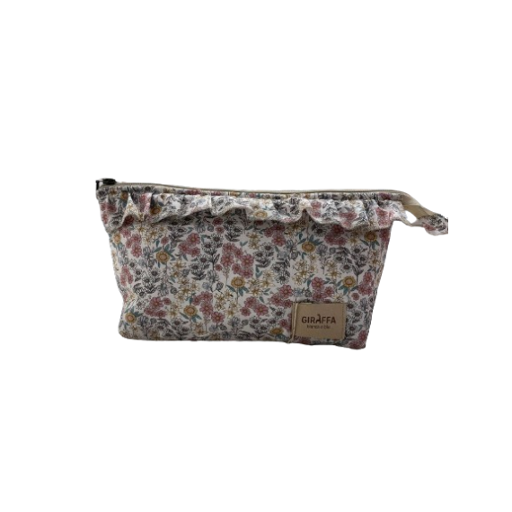 Este elegante neceser Emily de Giraffa Bianca e Blu te encantará por sus floridos volantes y su tejido de primera calidad.