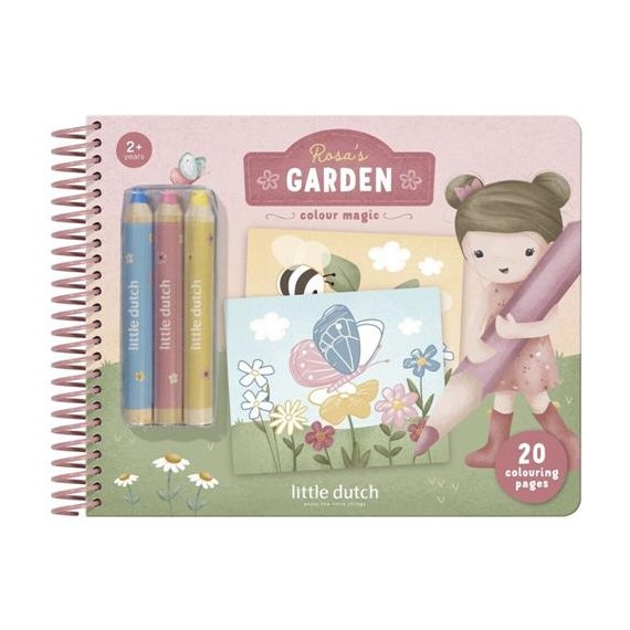Libro mágico inspirado en el jardín de la muñeca Rosa, incluye lápices de colores de madera, 20 páginas impresas y 10 páginas en blanco.