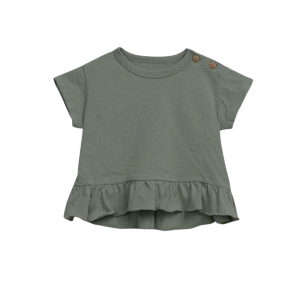 Esta camiseta está confeccionada en punto con una mezcla de algodón orgánico y algodón reciclado, en color Madalena. Presenta un cuello redondo y hombros ligeramente caídos, con una abertura en el hombro con botones de madera y un inserto de volante en la parte inferior.