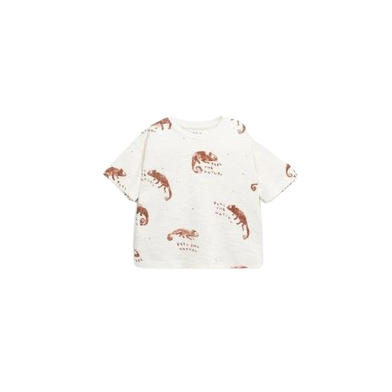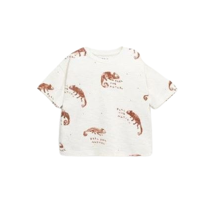 Esta camiseta está confeccionada en punto de algodón orgánico, en color Atelier. Presenta un cuello redondo y mangas cortas, tiene una abertura en el hombro con botones de coco y nuestro estampado de camaleones.
