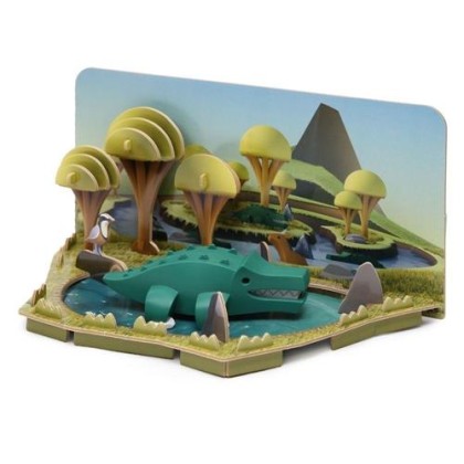 El set Crocodile con diorama de Halftoys es un rompecabezas 3D imantado con un puzle en su interior del esqueleto del animal. Incluye un diorama de cartón pluma que recrea su hábitat natural.