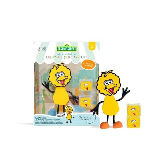 El Set de personaje Sesame Street Big Bird + 2 cubos de luz amarillos Glopals brillaran dentro del agua siendo tan sencillo apagarlo como sacándolos del agua.