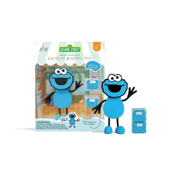 El Set de personaje Sesame Street Cookie Monster+ 2 cubos de luz azules Glopals brillaran dentro del agua siendo tan sencillo apagarlo como sacándolos del agua.