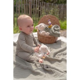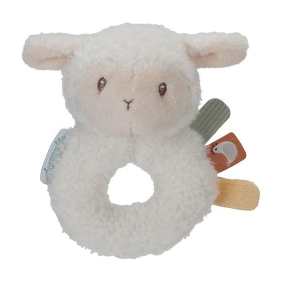 ¡Esta oveja suena! Cada vez que te mueves , tus esfuerzos son recompensados con un sonido de traqueteo. La forma de anillo hace que pueda ser fácilmente agarrado por las manitas pequeñas del bebé. Hay 3 pequeñas etiquetas en el sonajero para explorar que les encantarán.